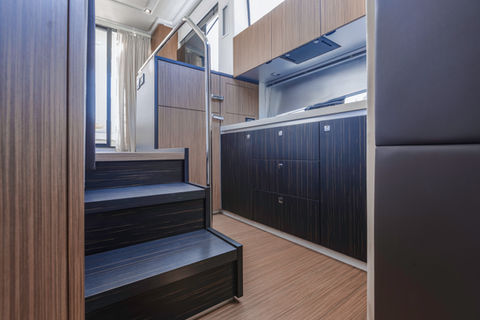 The main deck saloon is bright and open, with large windows, a comfortable seating area, dining space, and a fully equipped galley. The expansive flybridge offers a helm station, dining area, and sun loungers, ideal for enjoying the open air.