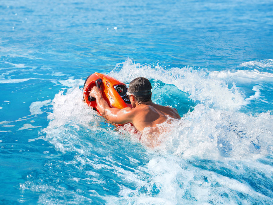 The SEABOB F5 is known for its remarkably low weight, weighing only 29 kg while boasting a propulsive force of 480 newtons. It features an E-Jet Power System with 4 power levels, giving it a sporty character and ensuring absolute fun and pleasure. Its exceptional performance in the water is a result of the high craft performance combined with a low power-to-weight ratio.
